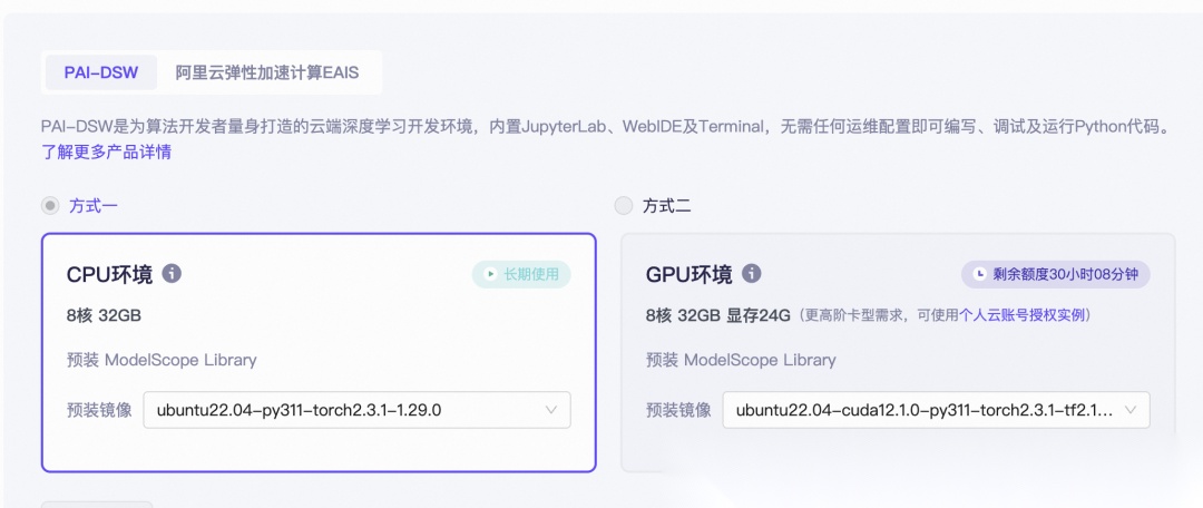 在训练部分,可能需要的资源比较大,这部分我是直接使用了modelscope的GPU免费资源来训练的,大家也可以自行申请使用。