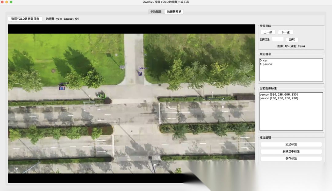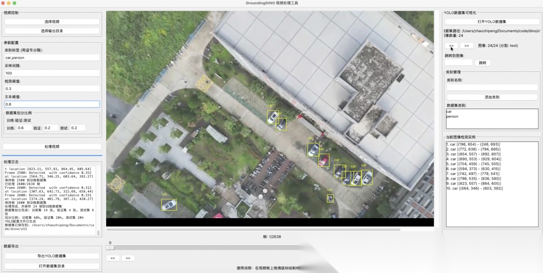 1、自动读取视频帧调用大模型检测,配置好视频的输入、数据集输出、要检测的类别、视频帧采样间隔、置信度阈值,yolo数据集train/val/test的划分比例等,就可以执行了,提取检测结果并将转换结果转换成为Yolo数据集的格式;