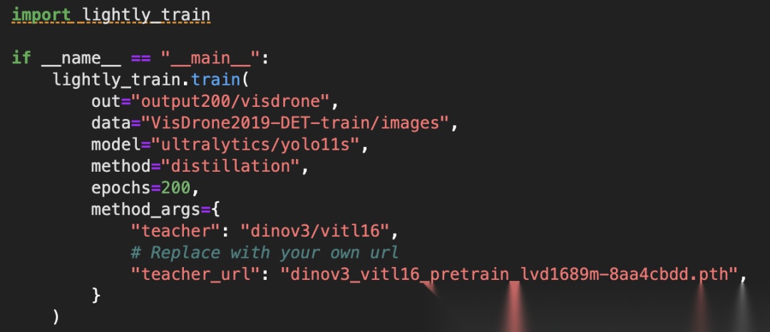 而DEIMv2为了提高实时性的要求就提供了蒸馏的小模型版本,而lightly-train恰好也提供了一个非常简单的通过基于教师-学生网络架构的自监督的方式进行dino v3到yolo或者DETR类模型的蒸馏。