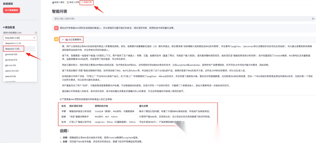 单轮问答:“请找出所有具备 RAG 项目实战经验的候选人,并以表格形式展示他们的姓名、相关项目名称、使用的技术栈和量化成果。”