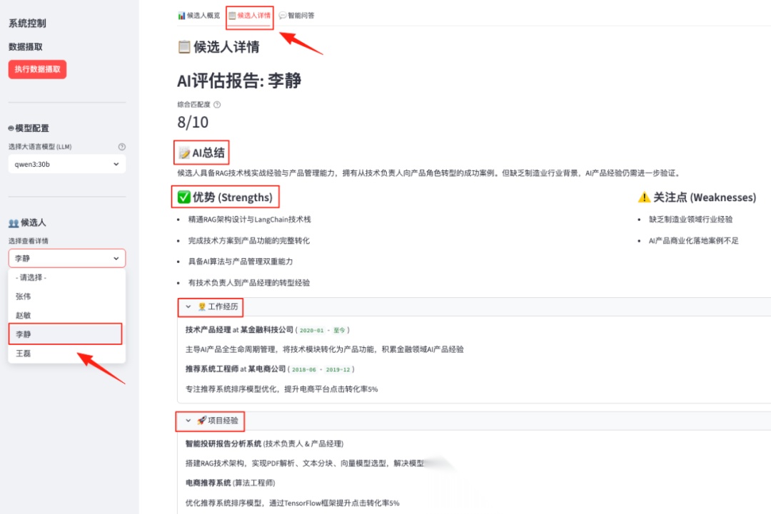 与此同时,数据处理流水线输出的完整简历文本,会经历一个结构化提取过程。这个过程调用大模型,根据预定义的 Pydantic 模型(Python 数据验证库,用于定义结构化数据格式),从纯文本中抽取出候选人的姓名、工作年限、项目经验、优劣势分析等关键信息,形成一份标准化的结构化档案。这份档案最终被存入 SQLite 结构化数据库(一个轻量级的关系型数据库)。这个数据库的作用是为最后的用户界面提供即时候选人信息查询服务,支撑系统的候选人概览和详情展示功能。