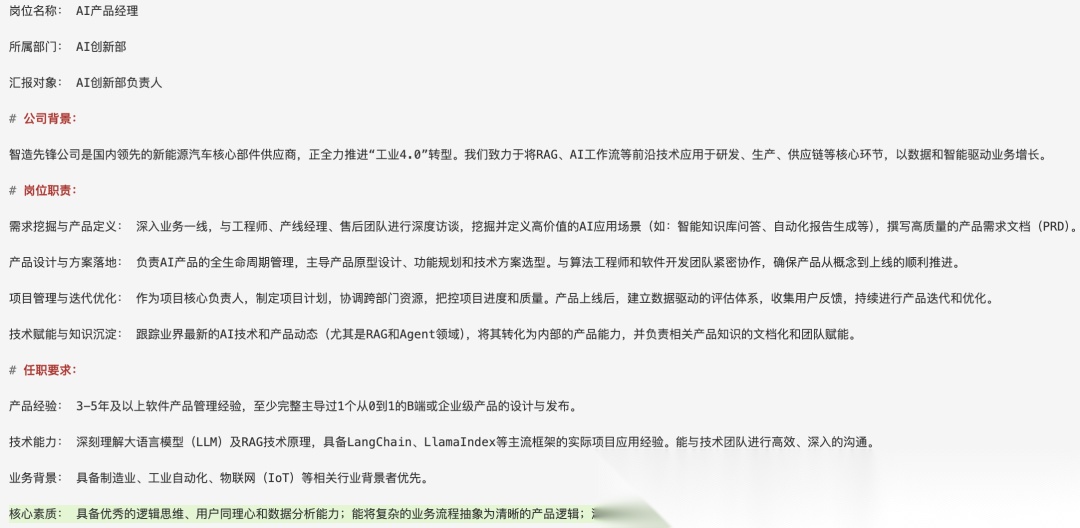所有筛选和评估逻辑围绕“AI 产品经理”职位展开。该岗位主要负责 RAG、AI 工作流等前沿技术在新能源汽车制造领域的产品化应用。具体查看下面截图