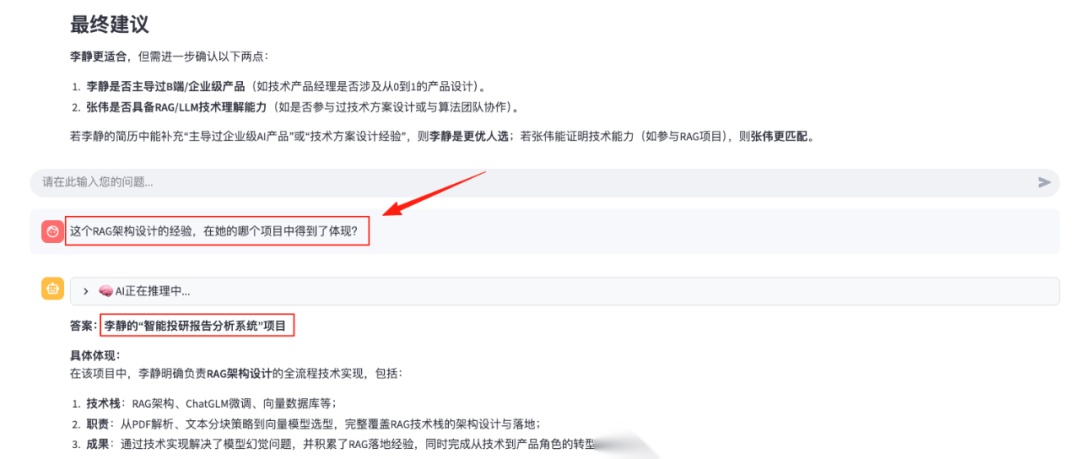 系统成功地理解了代词“她”(指代李静)和上下文中提及的“RAG 架构设计经验”,并精准地将这项抽象技能与“智能投研报告分析系统”这一具体项目关联起来。这有力地证明了 RunnableWithMessageHistory 组件的有效性,系统具备了真正连贯、有深度的对话能力。