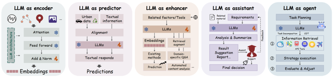 LLM在数字化应用的各个层面,几乎都能给我们加持,其预训练知识、上下文学习能力、泛化能力等已经在各种应用场景上已经取得广泛的成功。在应用或算法中,LLM可以承担编码器、预测器、助理、智能体等各种角色,下图是其能力和应用的简单示意[2]。