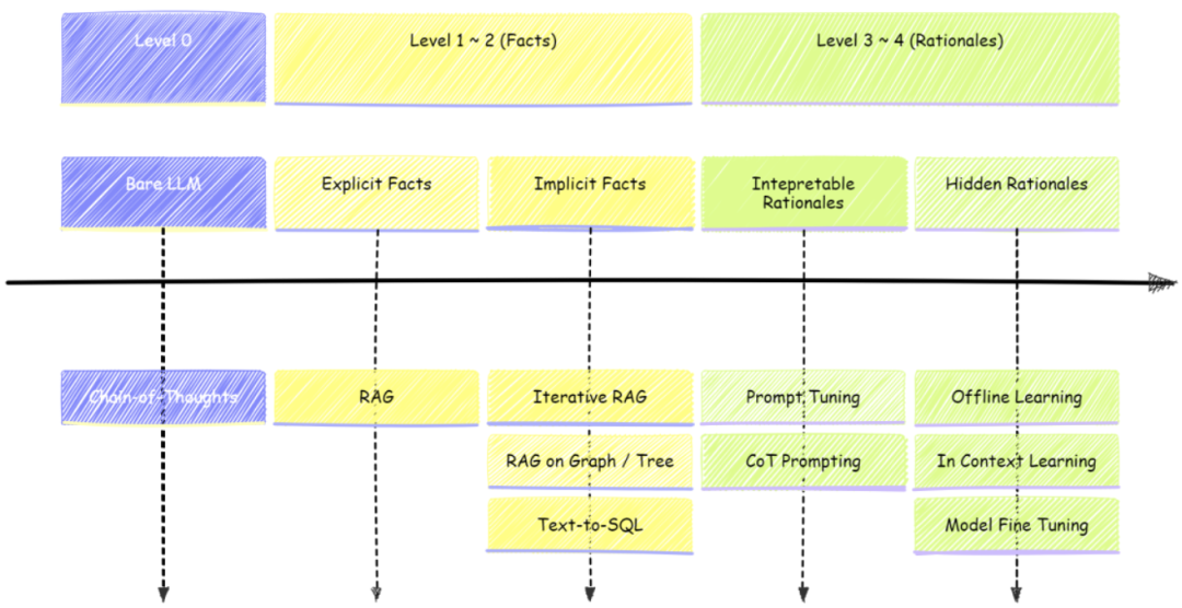 工具使用显然大大拓展了智能体的能力边界,近来大热的MCP(模型上下文协议)让LLM安全、便捷地连接并使用各种外部工具和服务,快速形成了生态。所谓记忆能力,可以分为短期记忆(Short-Term Memory)和长期记忆(Long-Term Memory),前者处理会话保持、超长输入等问题,而后者可以表现为大火的RAG(Retrieval augmented generation),即通过数据库、互联网检索等方式获取知识,增强模型能力。关于RAG是个非常热门的研究和工程实践领域,如下图[7]所示,针对不同的场景,可采用不同的方法,甚至可以专门为RAG做一个智能体,即Agentic RAG[8]。