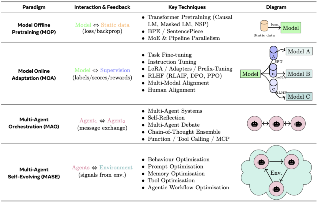 协同主要指多智能体框架下的智能体间协作解决问题,从目前实践看,单智能体,或者有明确专业分工的中心控制多智能体方案具有较好的效果,而去中心化架构、群体智能演进等研究在学术上是一个挺热的方向。LLM智能体要达到好的效果,关键是在迭代过程中自我学习,能力提升,这既包括通过微调等手段提升LLM本身的能力,也包括对智能体系统中的辅助模块进行优化,比如提示词、工具、知识记忆等。迭代中演进大大增强了LLM智能体的泛化能力,使其更易适应新的任务和环境,下图是一些典型的学习范式[9],限于篇幅,就不展开了。