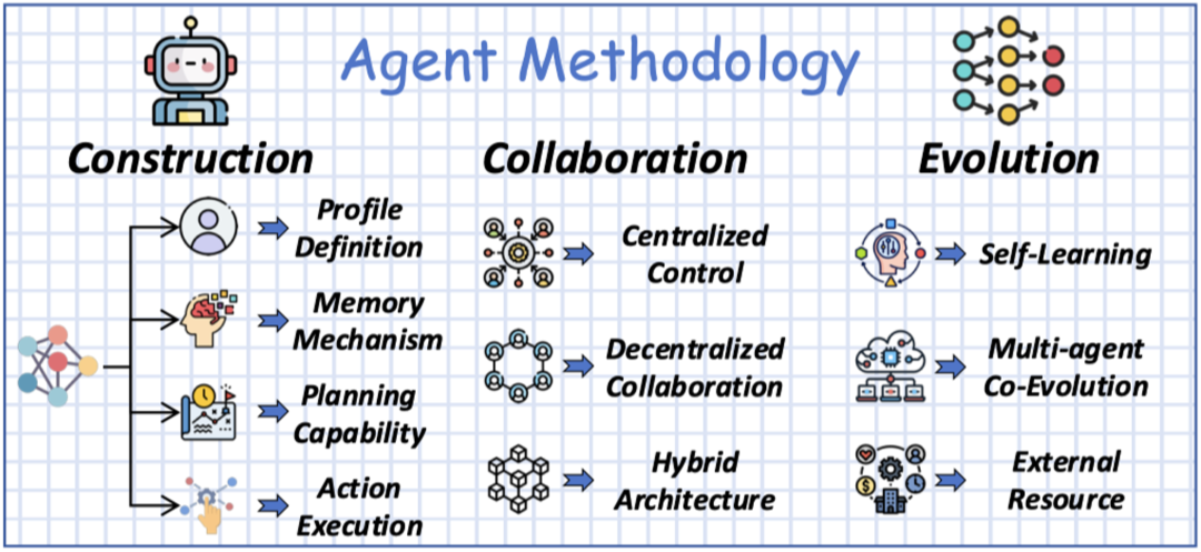 AI智能体是指能感知输入,目标推理,并和环境互动以完成任务的自动化系统[3]。在过去的AI研究中,智能体一般用于强化学习,其基于简单单一的策略行动,在孤立和受限环境中学习。而基于LLM的智能体(LLM-based agents)是指在开放真实的环境中,将LLM作为核心推理模块来理解输入、规划行为和产生输出的具备类人决策能力的自动化系统[4]。下面我们从LLM智能体的构建、协同和演进几个层面来简单说明,如下图[5]。