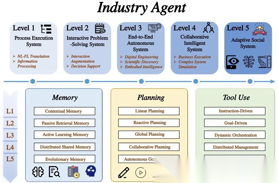 为了系统性地分析行业智能体的演进路径,本文提出了一个面向行业应用能力成熟度的五级框架(L1-L5)。该框架不仅是对智能体能力的划分,更揭示了能力跃迁背后的驱动力——即记忆、规划、工具使用这三大核心技术的演进。