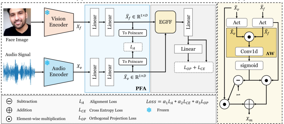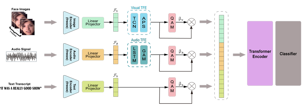 内容:论文提出一种双阶段跨模态网络(DCCN),用于精准检测对话中一方情绪被另一方无意识同步的“情感模仿”现象。第一阶段分别用基于 AST 和 ViT 的轻量级主干提取音频与视觉帧级特征,并通过时序卷积-注意力模块捕捉长短期动态;第二阶段的核心动态特征融合单元(DFF)利用跨模态注意力对齐音-视信息,再以可学习的“模态置信门”实时估计两路信号可靠度,对融合嵌入与原始特征进行残差式加权,既抑制噪声又保留互补线索。为缓解标签稀缺,作者引入“上下文情绪一致性”辅助任务,联合训练后仅用 0.3 M 额外参数就将收敛速度提升 38 %。
