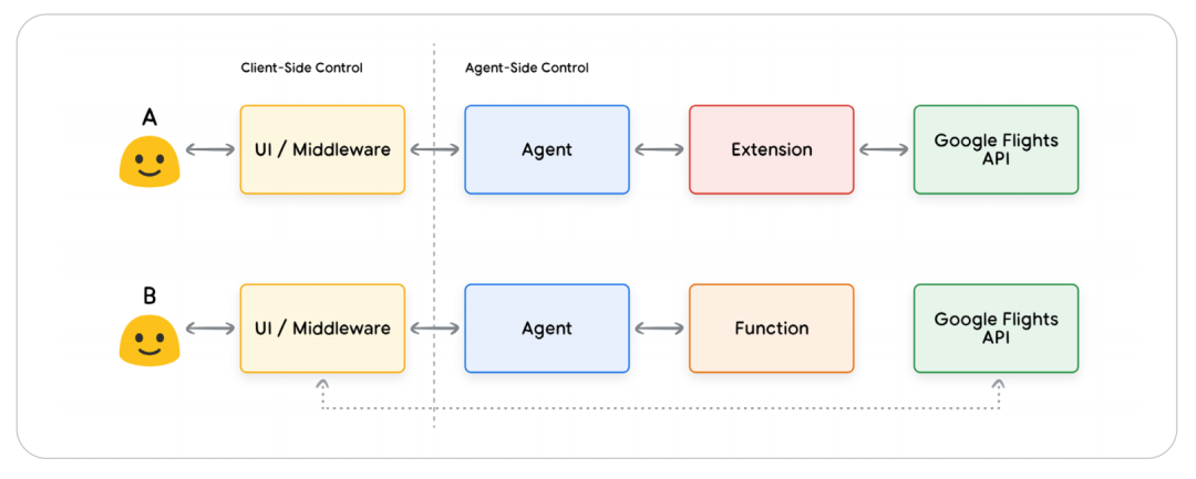 函数调用在概念上与扩展类似,但其执行模式有根本不同。在函数调用执行模式中,智能体不直接调用API,仅生成一个结构化的函数调用请求(包括函数名和参数),由客户端(如前端、中间件)执行API调用。这种设计让开发者获得更精细的控制权。而扩展与外部 API 的交互(如参数校验、API 调用、结果返回)均由智能体自主完成,无需客户端额外干预。