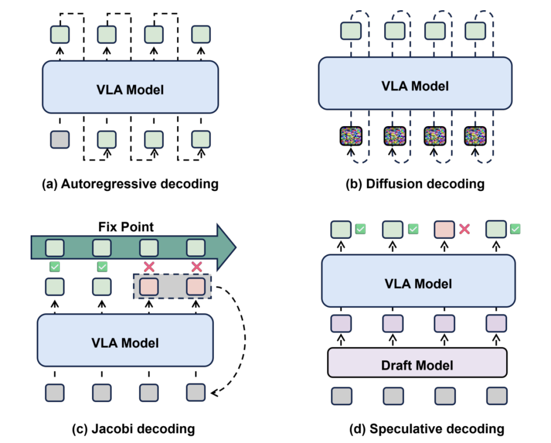 图9:VLA 模型中的编码机制。子图 (a) 和 (b) 分别展示了基于自回归和扩散降噪的主流方法。子图 © 和 (d) 展示了近年来为提高推理效率而设计的新方案,包括雅可比解码和推测解码