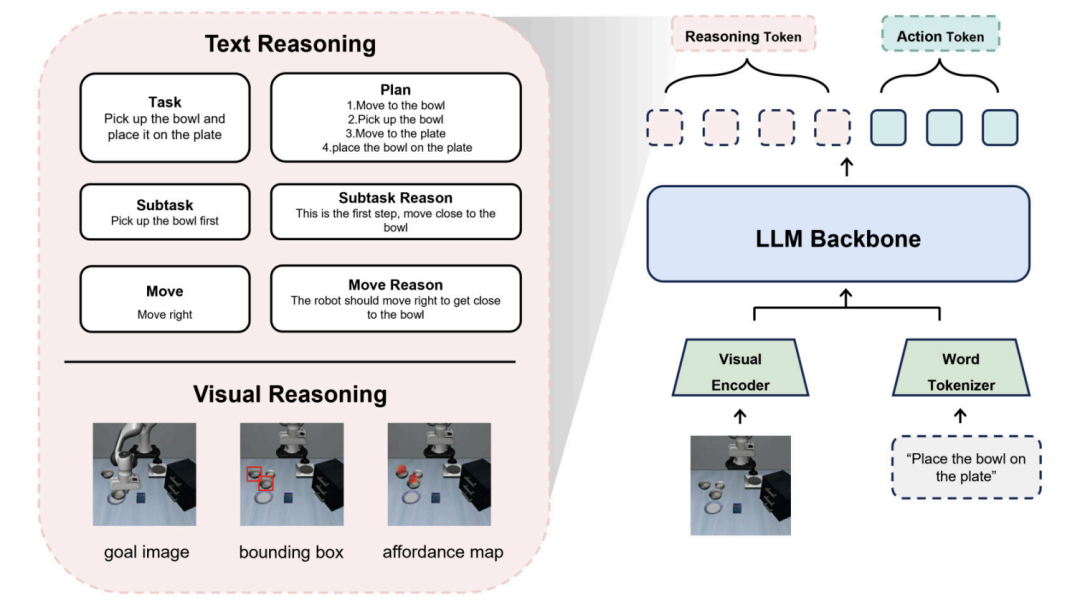 图8:带有推理能力的 VLA 模型。除了生成原始动作外,这些模型还能产生中间推理结果。文本推理可能包括任务列表、高层计划和详细执行步骤,而视觉推理则可能涉及目标状态、边界框或可操作性。此类推理有助于提高动作生成的清晰度