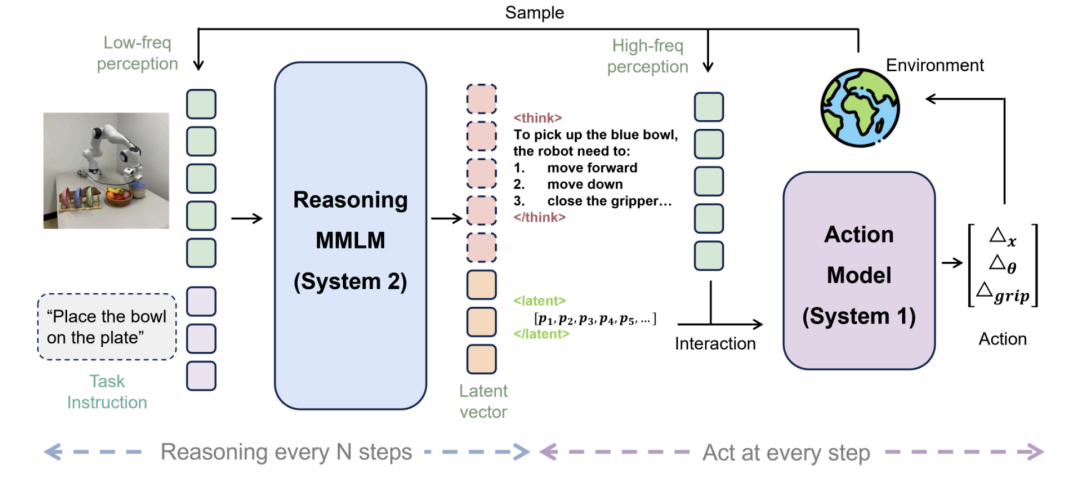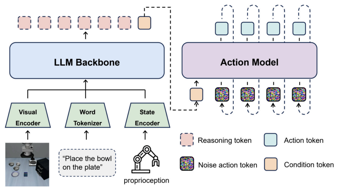尽管有这些进步,这两种方法仍然存在明显的局限性。直接行动生成在低延迟环境中虽然高效,但由于缺乏明确的推理信号,在不同实施例之间转移时往往难以持续表现,尤其是在长期任务中。基于推理的方法通过要求生成长序列的中间标记显著增加了计算负担,对实时控制环境中的部署提出了挑战。当前的解决方案如异步推理和部分步骤更新在一定程度上缓解了这个问题,但未能解决推理密集型范式固有的结构性低效问题。