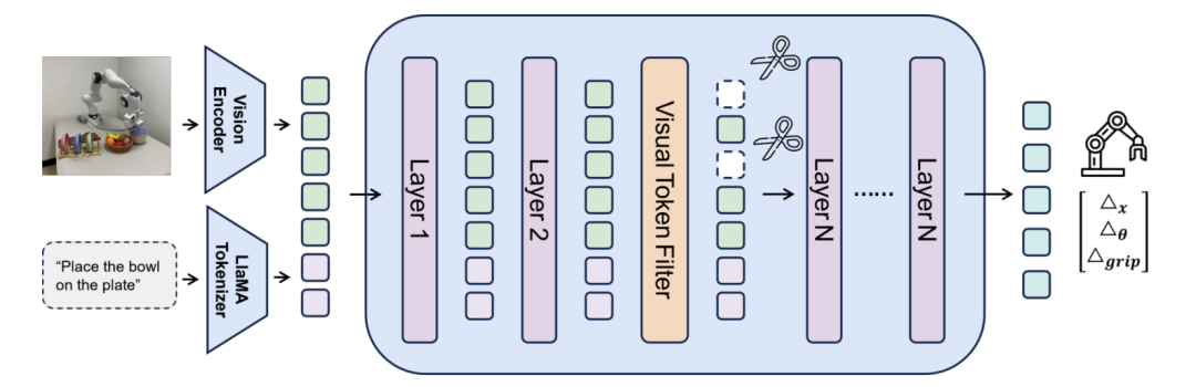 - 动态剪枝:LightVLA采用查询驱动的标记选择机制,通过跨模态注意力动态生成查询,识别最具信息量的视觉标记。ADP引入两阶段机制,首先计算文本查询和跨模态特征的静态剪枝,然后根据动作动态调整剪枝。