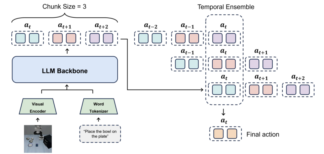 图7:动作分块机制示意图。一次前向推理即可生成多个时间步的动作,以提高效率;而时间集成则在时间维度上整合这些动作,以减少偏差和方差