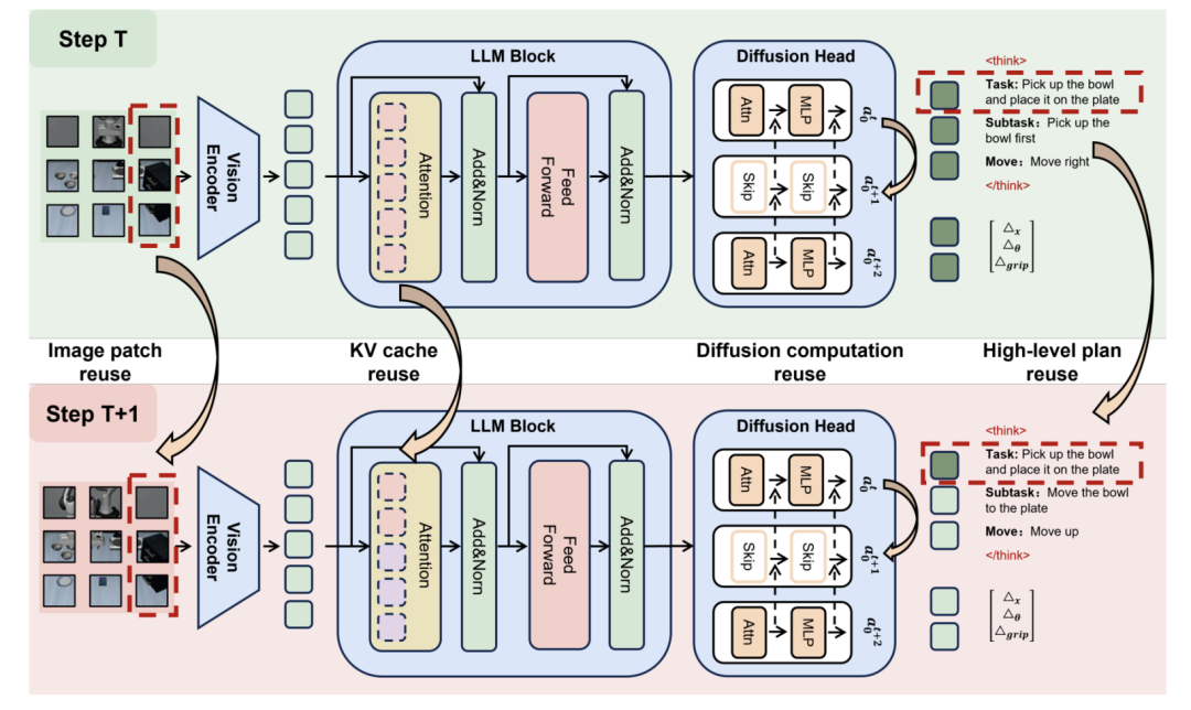 - 动作推理中的时间复用:EfficientVLA采用固定间隔缓存策略,每N步重新计算特征,并在其间重用缓存的表示。Fast ECoT通过模块级缓存重用变化缓慢的推理结果,结合连续批处理实现显著的效率提升。