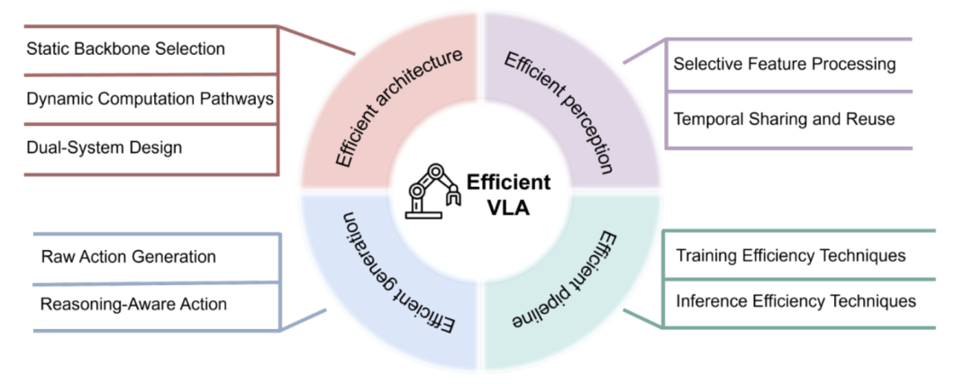 本文旨在系统性综述 VLA****模型效率优化的方法,涵盖模型架构、感知特征、动作生成以及训练和推理策略四个方面。