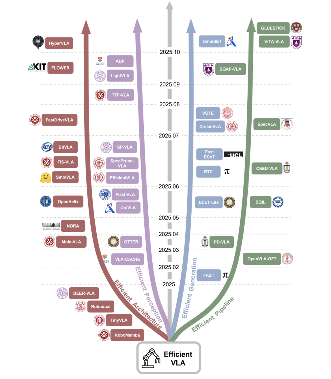 图3:高效 VLA 算法的发展轨迹。该图突出了近年来专注于提升 VLA 模型效率的代表性工作