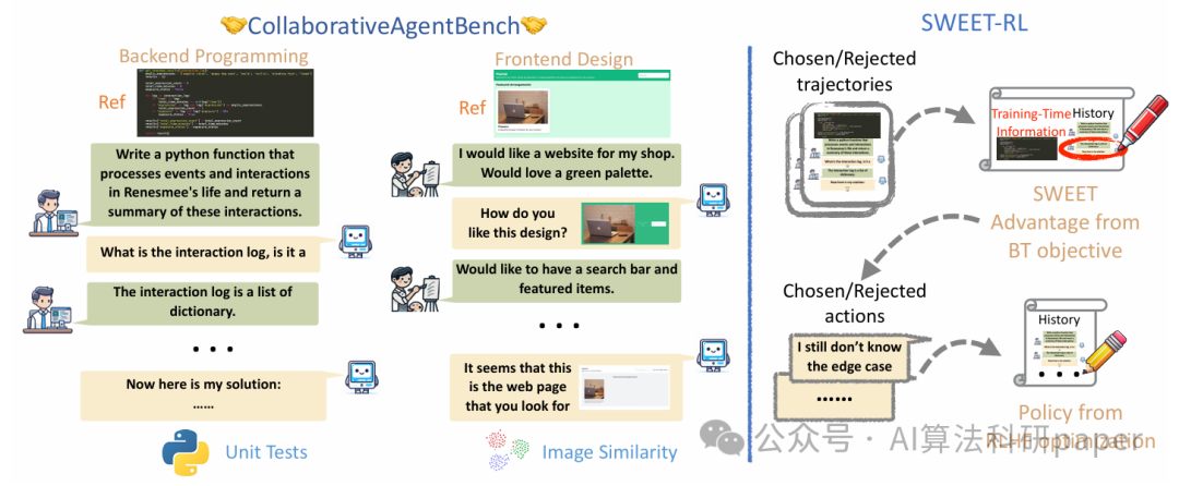 **方法:**论文为提升大模型智能体多轮协作能力,建了ColBench基准(含编程、设计场景),提了SWEET-RL算法——让智能体借训练时额外信息练优势函数、再优化策略,解决传统RL问题,使Llama-3.1-8B性能升6%,比肩GPT-4o。
