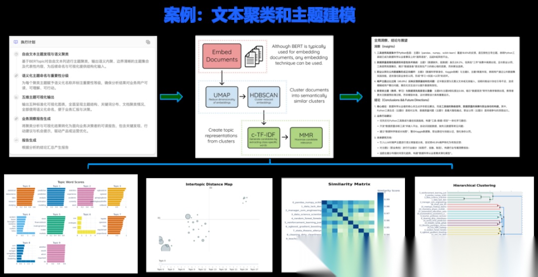 举一个例子, 用Data Agent分析《2017年Kaggle 机器学习和数据科学调查》 公开数据集,Data Agent 可以利用BERTopic,将基于 Transformer 的嵌入模型,聚类以及自定义 TF-IDF 策略相结合,创建可解释且语义上有意义的主题,再结合LLM的语言理解能力,可以给出人能看得懂的分析报告。