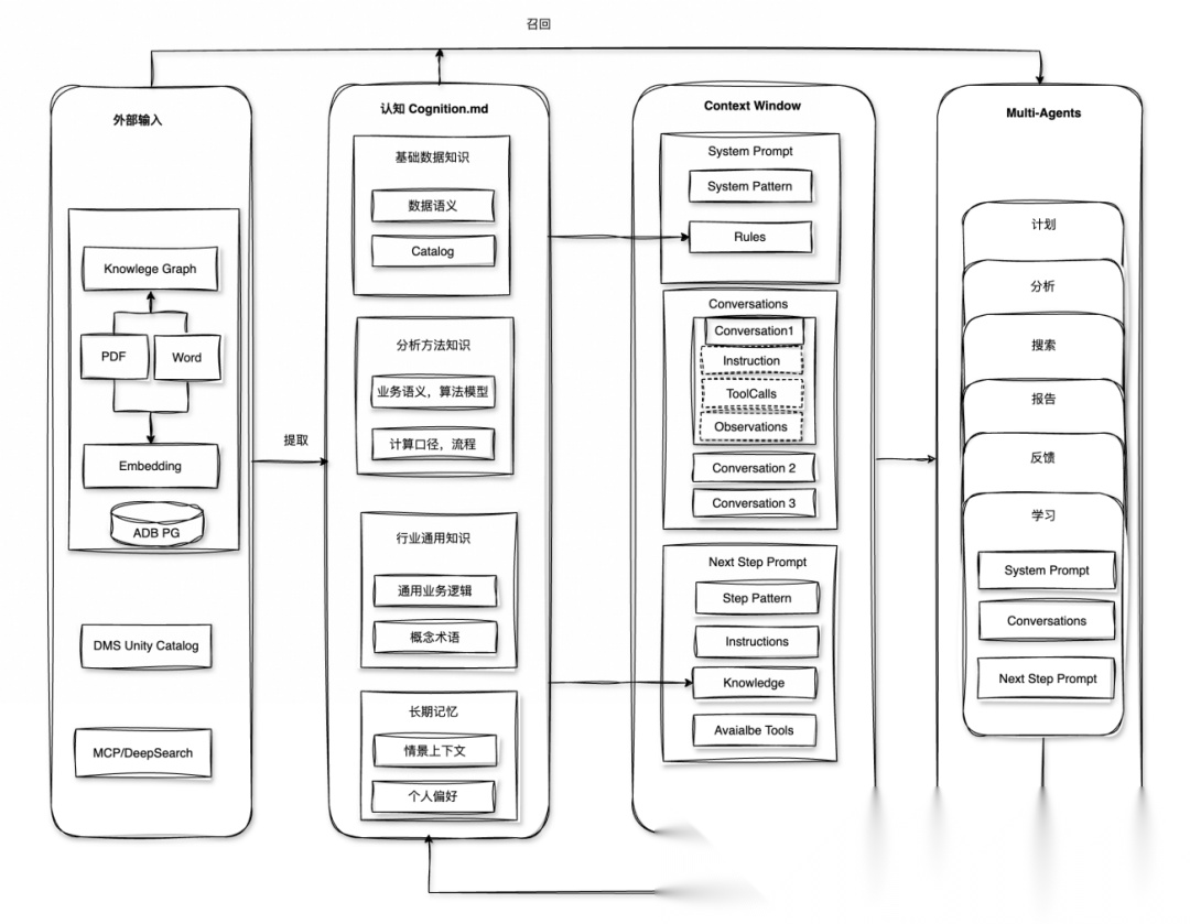 如下图,Data Agent 的上下文管理实际上是一个完整的智能认知系统的构建,核心流程如下:从规划,分析,反思到学习,构建一个完整的智能认知系统。