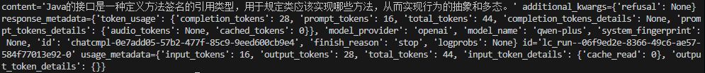 result = llm.invoke("用一句话解释什么是Java的接口?")