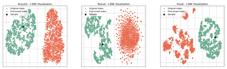 为了分析微调对相似性测量的影响,我们使用t-SNE可视化了检索到的样本。我们从IEMOCAP数据集(四类)中随机选取一个样本,并从原始特征索引和微调特征索引中检索到与该样本最相似的1502个样本。图3中的红色和绿色点分别表示原始特征和微调后的特征,而黑色“X”标记了查询样本。结果表明,在所有模态下,微调后的特征都更集中在查询点周围,这表明微调后检索准确性有所提升。
