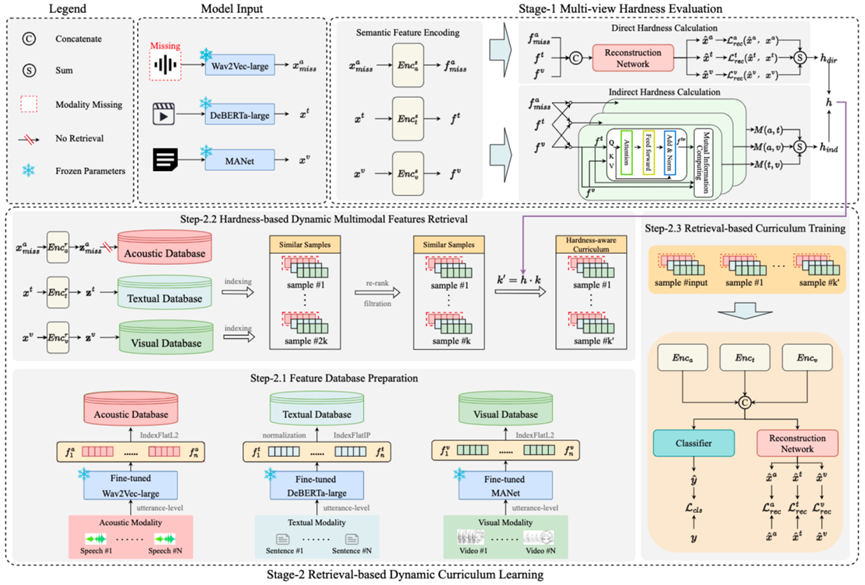 2)我们引入了一种基于检索的动态课程学习策略,该策略根据估计的难度动态检索语义相关的样本,并自适应地调整它们的数量以平衡简单和困难实例之间的学习,从而增强模型在缺失模态条件下的鲁棒性。