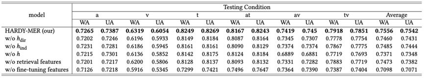 表2:六种缺失条件下的消融实验结果。我们报告了这些实验在IEMOCAP四类任务上的加权精度(WA)和未加权精度(UA)。