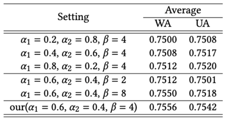 和β进行了消融研究。我们报告了六种缺失模态场景的平均WA和UA分数,如表3所示。结果表明,增加
