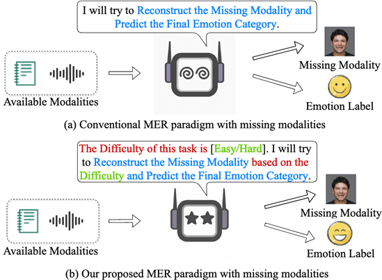 图1 缺失模态下情绪识别的常规范式与我们提出的HARDY-MER的比较。(a)传统方法试图在不考虑重建难度的情况下重建缺失模态并预测情绪,这可能导致难样本的处理不理想。(b)我们提出的HARDY-MER首先估计样本特定的难度,然后根据估计的难度将更多的注意力分配给难样本,从而增强模型在具有挑战性实例的情绪识别方面的鲁棒性。