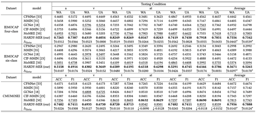 表1:在两个基准数据集上,在六种可能的缺失模态条件下,与最先进的方法(SOTA)的性能比较。“Average”是指模型在所有六种缺失模态条件下的平均性能。每个数据集中的最佳结果以粗体突出显示,第二好结果以下划线标示。标有ΔSota的行表示与最佳竞争方法相比,我们的方法有所改进或减少。我们对“Average”列进行了T检验,∗表明p值<0.05。