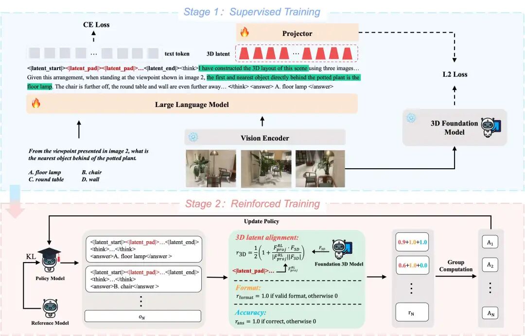 论文简评: 这篇论文探讨了在有限视角下进行3D空间推理的挑战,并提出了一个名为3DThinker的新框架。3DThinker通过利用视觉语言模型中的3D潜在表示进行推理,无需依赖显式标注的3D数据。该方法包括两个训练阶段:首先通过监督学习将3D潜在特征对齐,然后通过强化学习优化推理轨迹。实验结果表明,3DThinker在多个基准测试中均优于现有的强基线模型,并展示了将3D表示统一到多模态推理中的新视角。