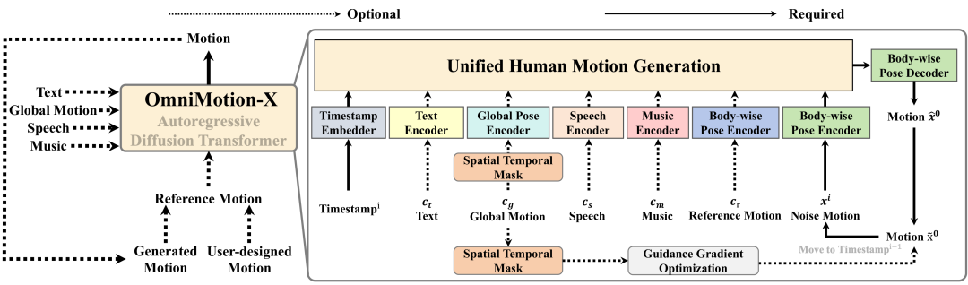 论文简评: 这篇论文提出了OmniMotion-X,一个用于全身动作生成的多模态框架,结合了自回归扩散变压器以支持文本到动作、音乐到舞蹈、语音到手势等多种任务。通过引入参考动作作为条件信号,OmniMotion-X显著提高了生成内容的一致性和动态表现。作者还构建了OmniMoCap-X,这是一个整合了28个公开MoCap源的多模态动作数据集,旨在提高训练质量。实验结果显示,OmniMotion-X在多个多模态任务中表现优异,能够生成真实、连贯且可控的长时动作。
