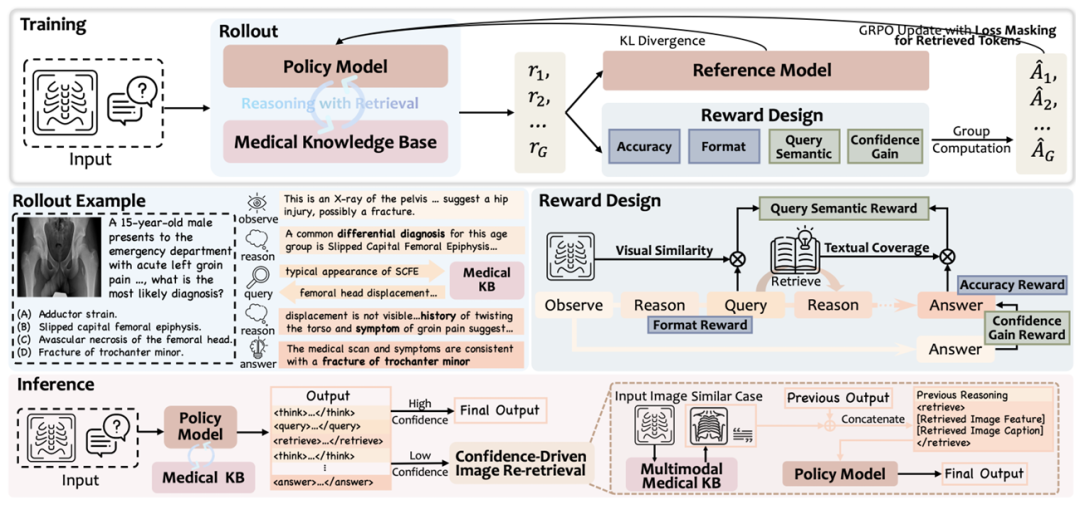 论文简评: 这篇论文的动机在于提升医疗多模态大语言模型(MLLMs)的推理能力,以便更好地分析医学影像并提供可靠的诊断。传统的医疗MLLMs在推理时仅依赖内部知识,可能导致虚构的推理和事实错误。为解决此问题,作者提出了一个多模态医学推理与检索框架(MED-RWR),通过查询外部知识来增强推理过程。具体来说,论文设计了一种两阶段的强化学习策略,激励模型结合视觉和文本信息进行检索。实验结果表明,MED-RWR在多个公共医疗基准测试上表现优于基线模型,并在数据稀缺的领域(如超声心动图)显示出显著的泛化能力。