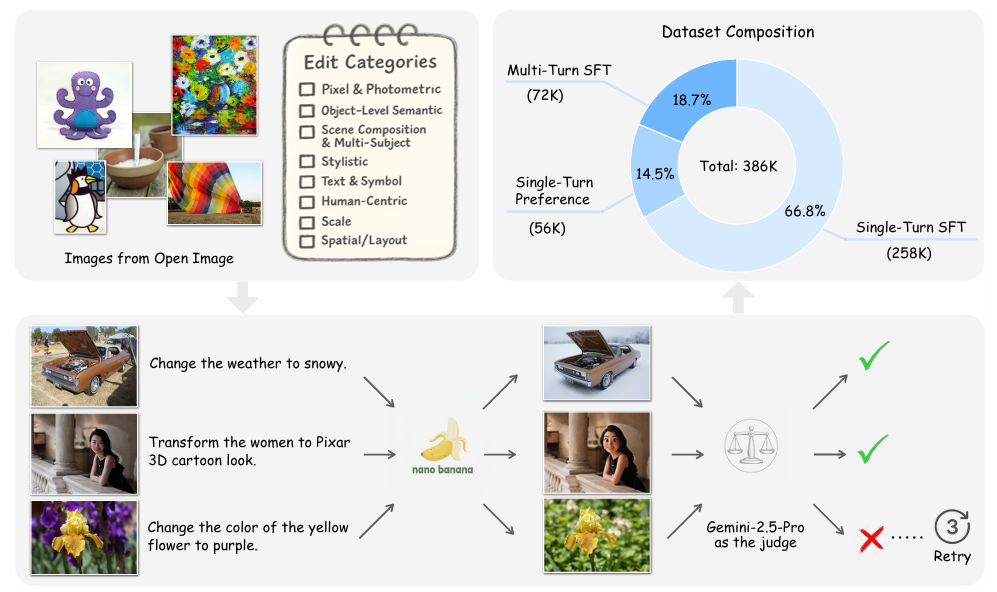 Recent advances in multimodal models have demonstrated remarkable text-guided image editing capabilities, with systems like GPT-4o and Nano-Banana setting new benchmarks. However, the research community’s progress remains constrained by the absence of large-scale, high-quality, and openly accessible datasets built from real images. We introduce Pico-Banana-400K, a comprehensive 400K-image dataset for instruction-based image editing. Our dataset is constructed by leveraging Nano-Banana to generate diverse edit pairs from real photographs in the OpenImages collection. What distinguishes Pico-Banana-400K from previous synthetic datasets is our systematic approach to quality and diversity. We employ a fine-grained image editing taxonomy to ensure comprehensive coverage of edit types while maintaining precise content preservation and instruction faithfulness through MLLM-based quality scoring and careful curation. Beyond single turn editing, Pico-Banana-400K enables research into complex editing scenarios. The dataset includes three specialized subsets: (1) a 72K-example multi-turn collection for studying sequential editing, reasoning, and planning across consecutive modifications; (2) a 56K-example preference subset for alignment research and reward model training; and (3) paired long-short editing instructions for developing instruction rewriting and summarization capabilities. By providing this large-scale, high-quality, and task-rich resource, Pico-Banana-400K establishes a robust foundation for training and benchmarking the next generation of text-guided image editing models.