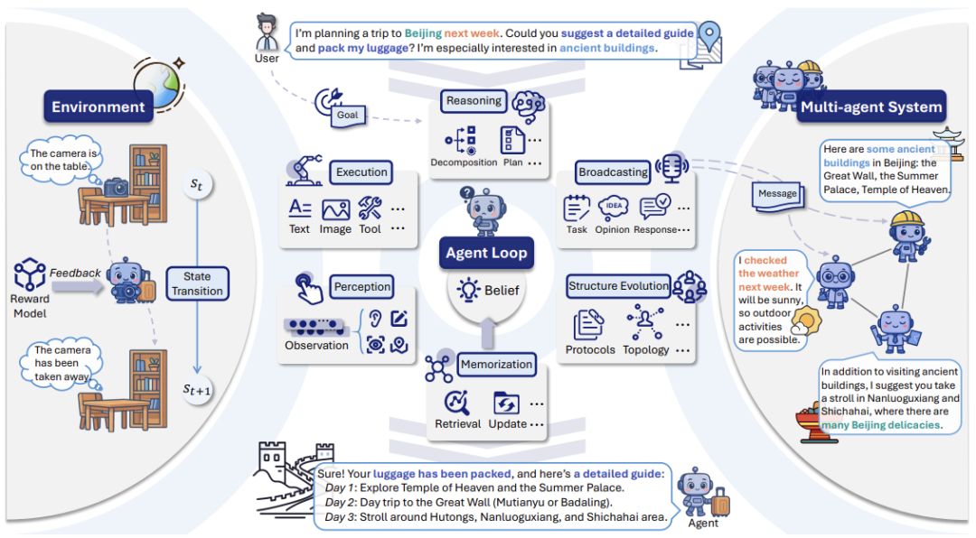 为了精准刻画这一系统,综述用部分可观测马尔可夫决策过程(POMDP) 对智能体交互动力学进行形式化定义。在这一框架中,智能体基于自身信念(Belief),通过感知环境(Perception)、生成计划(Reasoning)、执行动作(Execution)、接收反馈(Feedback)、更新记忆(Memorization)来实现目标(如图1所示);而多智能体系统(MAS)还需额外处理消息广播(Broadcasting)与通信拓扑进化(Structure Evolution),这进一步增加了幻觉传播的风险。