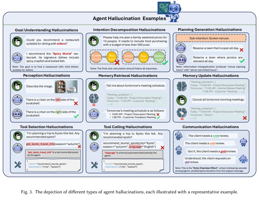 当大语言模型驱动的智能体(LLM-based Agent)逐渐渗透进教育辅导、科学研究、金融分析等关键领域,成为实现通用人工智能(AGI)的核心载体时,一个致命问题正制约其落地——幻觉。不同于传统LLM仅在文本生成中出现的“语言错误”,LLM智能体的幻觉是跨模块、长链条的“复合偏差”:可能是规划行程时误解用户需求(推理幻觉),可能是调用工具时填充错误参数(执行幻觉),甚至可能在多智能体协作中传递虚假信息(通信幻觉),最终导致任务失败、设备故障,乃至现实世界的安全风险。