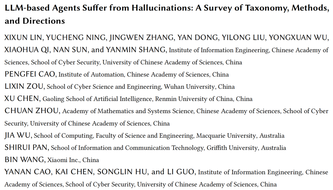 正是在这一背景下,来自中国科学院信息工程研究所、中国科学院自动化研究所、中国科学院数学与系统科学研究院、武汉大学、中国人民大学、麦考瑞大学、格里菲斯大学等机构的研究者,联合小米等企业团队,发布了首篇聚焦LLM智能体幻觉的全面综述——《LLM-based Agents Suffer from Hallucinations: A Survey of Taxonomy, Methods, and Directions》。这篇综述不仅首次厘清了智能体幻觉的本质,更提出全新分类框架、拆解18大触发原因、总结10种缓解策略,并开源300+相关研究论文库,为打造可靠、安全的智能体系统提供了关键参考。