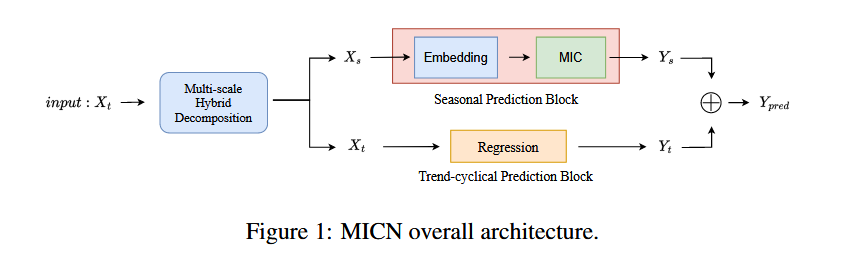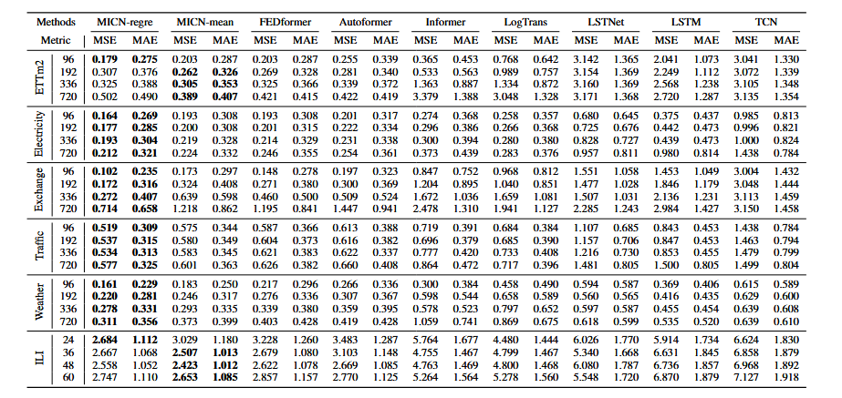 - 提出基于卷积结构的MICN来高效替代自注意力,并实现线性计算复杂度和内存成本。