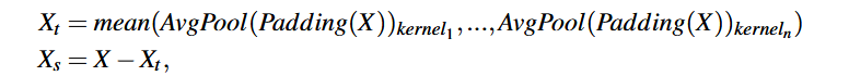采用不同大小的kernel控制不同的分解模式,对多个kernel平均池化的结果取平均得到Trend-cyclical项,输入序列减去Trend-cyclical项得到Seasonal项。