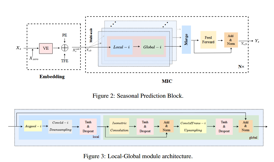 季节预测块首先对输入序列的季节部分进行Embedding,再通过N个堆叠的MIC层进行预测。每个MIC层有多个分支(branch),每个分支采取不同的尺度大小,对不同的时间模式进行建模。