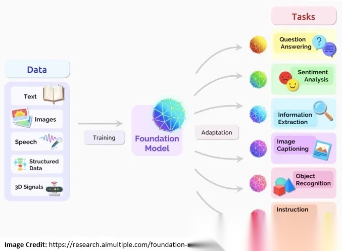 尽管如此,大语言模型通常在与语言相关的数据(如文本)上进行训练。而基础模型通常在多模态数据(文本、图像、音频等的混合)上进行训练。更重要的是,基础模型旨在作为更特定任务的基础或基石: