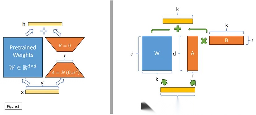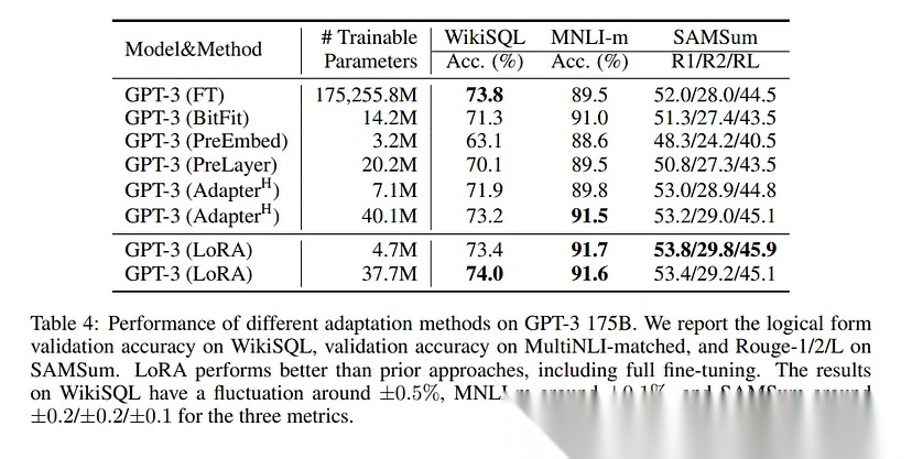 以GPT-3 175B为例,LoRA研究团队证明,即使全秩(即d)高达12288,非常低的秩(即图1中的r可以是1或2)也足够了,这使得LoRA在存储和计算上都非常高效。