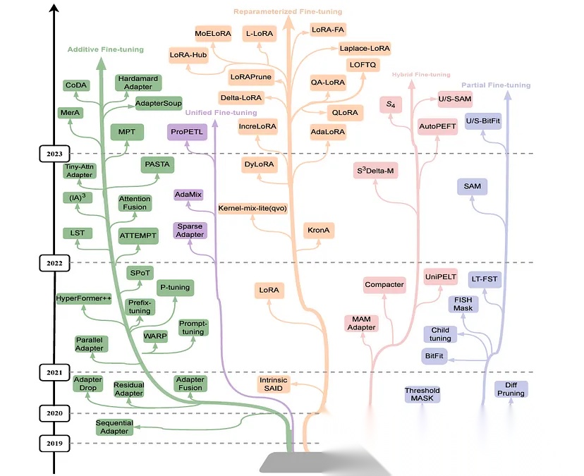 PEFT,即参数高效微调(Parameter Efficient Fine-Tuning),是一组以最节省计算资源和时间的方式微调大型模型的技术或方法,同时不会出现我们可能在全量微调中看到的性能损失。之所以采用这些技术,是因为随着模型越来越大,例如拥有1760亿参数的BLOOM模型,在不花费数万美元的情况下对其进行微调几乎是不可能的。但有时为了获得更好的性能,使用这样的大型模型又几乎是必要的。这就是PEFT发挥作用的地方,它可以帮助解决在处理这类大型模型时遇到的问题。