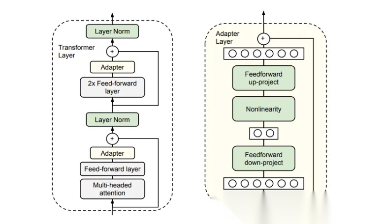 在左边,是添加了适配器层的修改后的Transformer架构。我们可以看到适配器层添加在注意力堆栈和前馈堆栈之后。在右边,是适配器层本身的架构。适配器层采用瓶颈架构,它将输入缩小到较小维度的表示,然后通过非线性激活函数,再将其放大到输入的维度。这确保了Transformer堆栈中的下一层能够接收适配器层生成的输出。