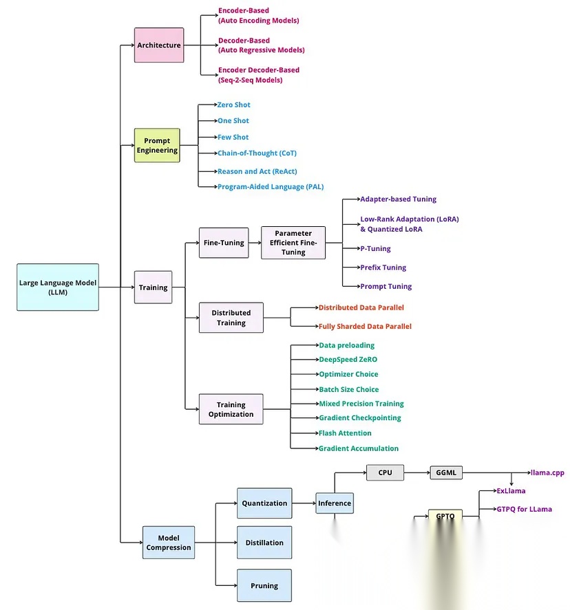 本文全面梳理了大模型的各方面知识点,包括参数微调(PEFT)技术,适配器、LoRA和QLoRA,同时介绍了提示策略、模型压缩方法(如剪枝和量化),以及各种量化技术(GPTQ、NF4、GGML)。最后,对用于减小模型大小的蒸馏和剪枝技术也进行了讲解,希望对大家有帮助!