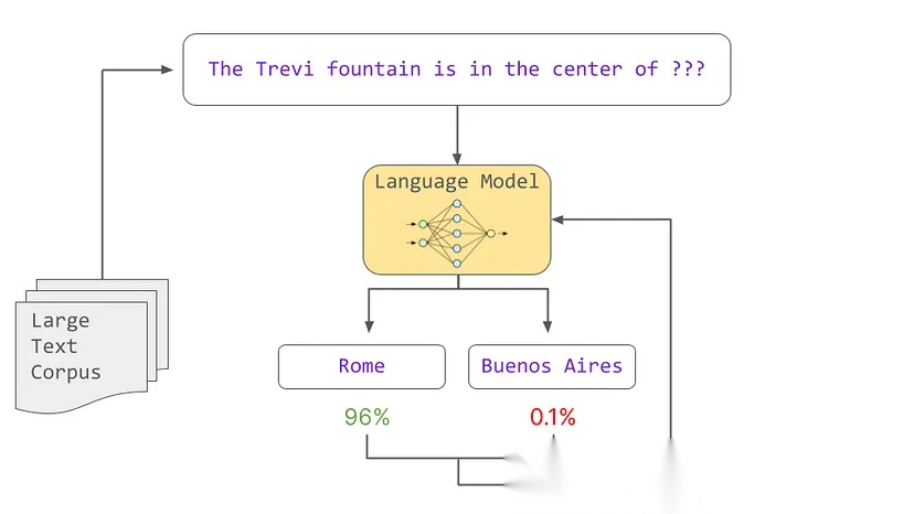 在训练过程中,从语料库中提取文本序列并进行截断。语言模型计算缺失单词的概率,然后通过基于梯度下降的优化机制对这些概率进行微调,并反馈给模型以匹配真实情况。这个过程在整个文本语料库上重复进行。