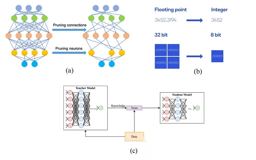 模型压缩方法包括:(a)剪枝、(b)量化和(c)知识蒸馏。