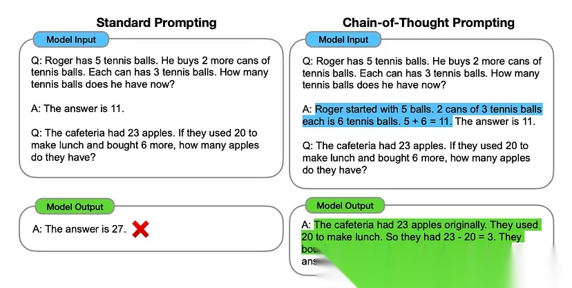 思维链(CoT)提示(Wei等人,2022)会生成一系列短句子,逐步描述推理逻辑,即推理链或推理依据,最终得出答案。在使用大型模型(例如参数超过500亿的模型)处理复杂推理任务时,CoT的优势更为明显。而简单任务使用CoT提示的受益则相对较小。